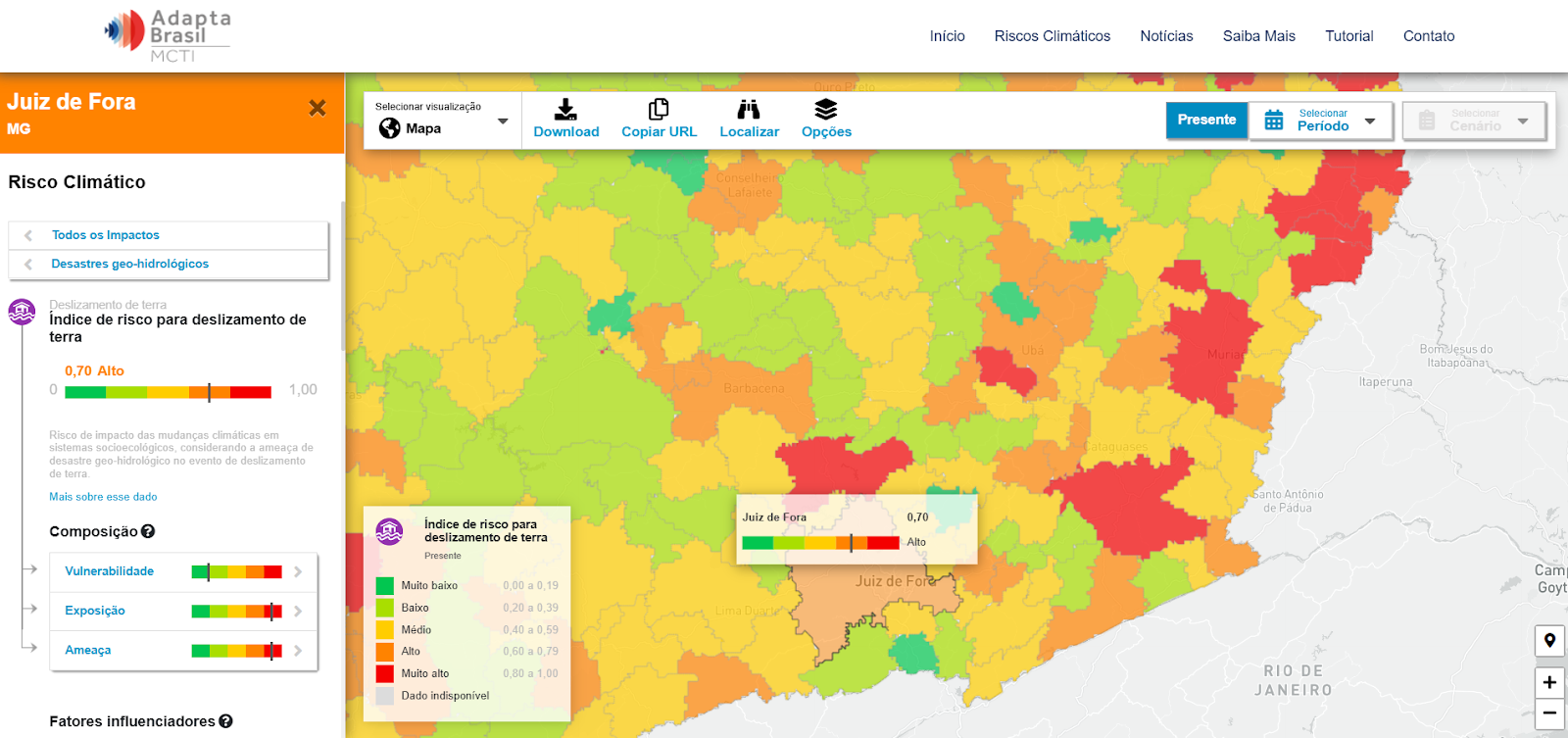 Reportagens recentes do portal O Globo e do G1 destacam o risco de deslizamentos na cidade de Juiz de Fora no estado mineiro e apontam que mais de dois mil municípios brasileiros estão expostos a desastres naturais. As informações foram embasadas nos dados do AdaptaBrasil MCTI, reforçando a relevância da plataforma para apoiar o planejamento e criação de soluções para a adaptação climática dos municípios.